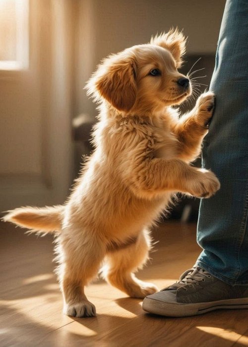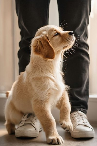 • Once your puppy is standing with all four paws on the floor, bend down to offer calm, affectionate attention. This should be gentle and composed, emphasizing a relaxed demeanor rather than excitement.